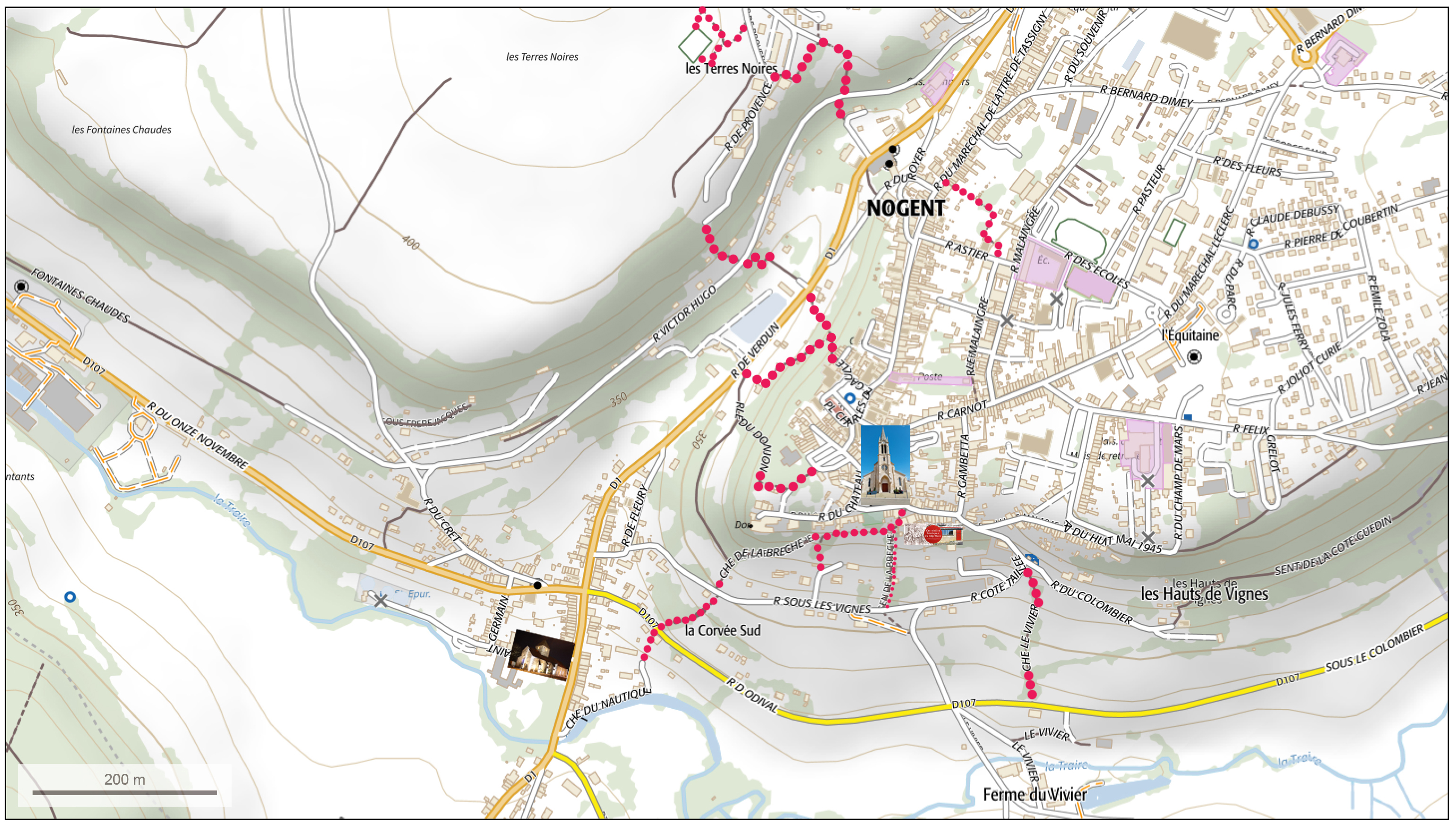 Depuis Nogent le bas, Venez découvrir plusieurs chemins comme le chemin du vivier, le chemin du nautique, le chemin de la brèche, la voie romaine, le sentier pour rejoindre la rue verdun... Depuis le sentier de la brèche, vous pourrez arriver à la Boutique à Jojo et avoir un belvédère depuis le sentier de la brèche depuis la boutique à Jojo.
