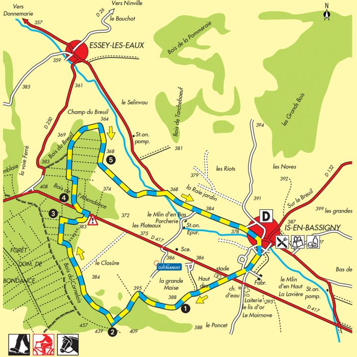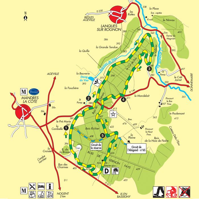 Depuis la place de la Mairie, prendre à droite en suivant la D132, traverser le Rognon et monter en direction du terrain de Football. Traverser prudemment la D417 et prendre en face un chemin caillouteux qui part vers la forêt.