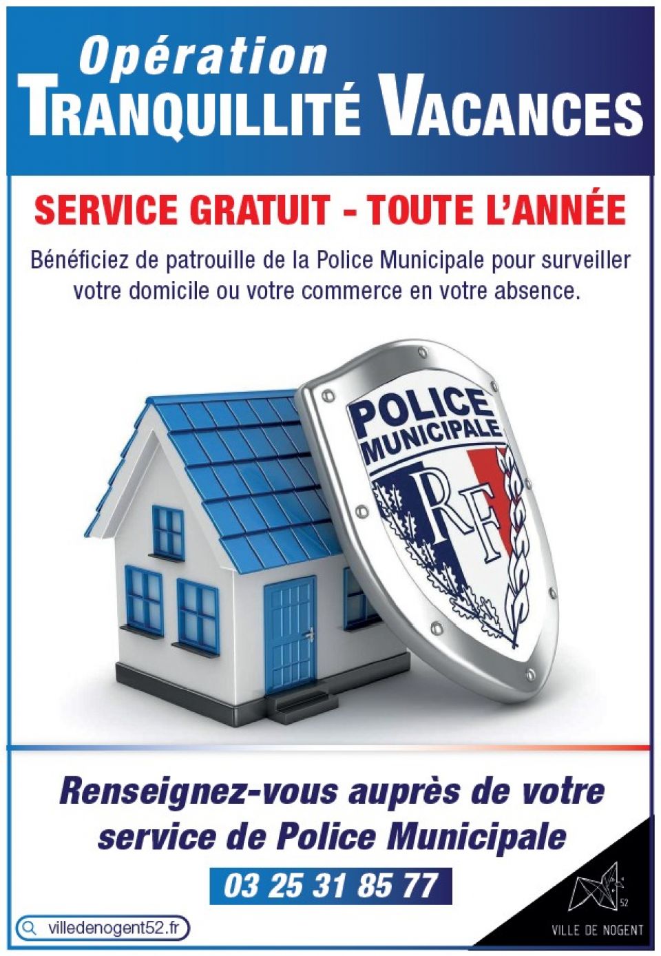 Pendant toute absence prolongée de votre domicile, vous pouvez vous inscrire à l'opération tranquillité vacances. Les services de police ou de gendarmerie se chargent alors de surveiller votre logement. Des patrouilles sont organisées pour passer aux abords de votre domicile. Vous serez prévenu en cas d'anomalies (dégradations, cambriolage ...). Ci dessous,